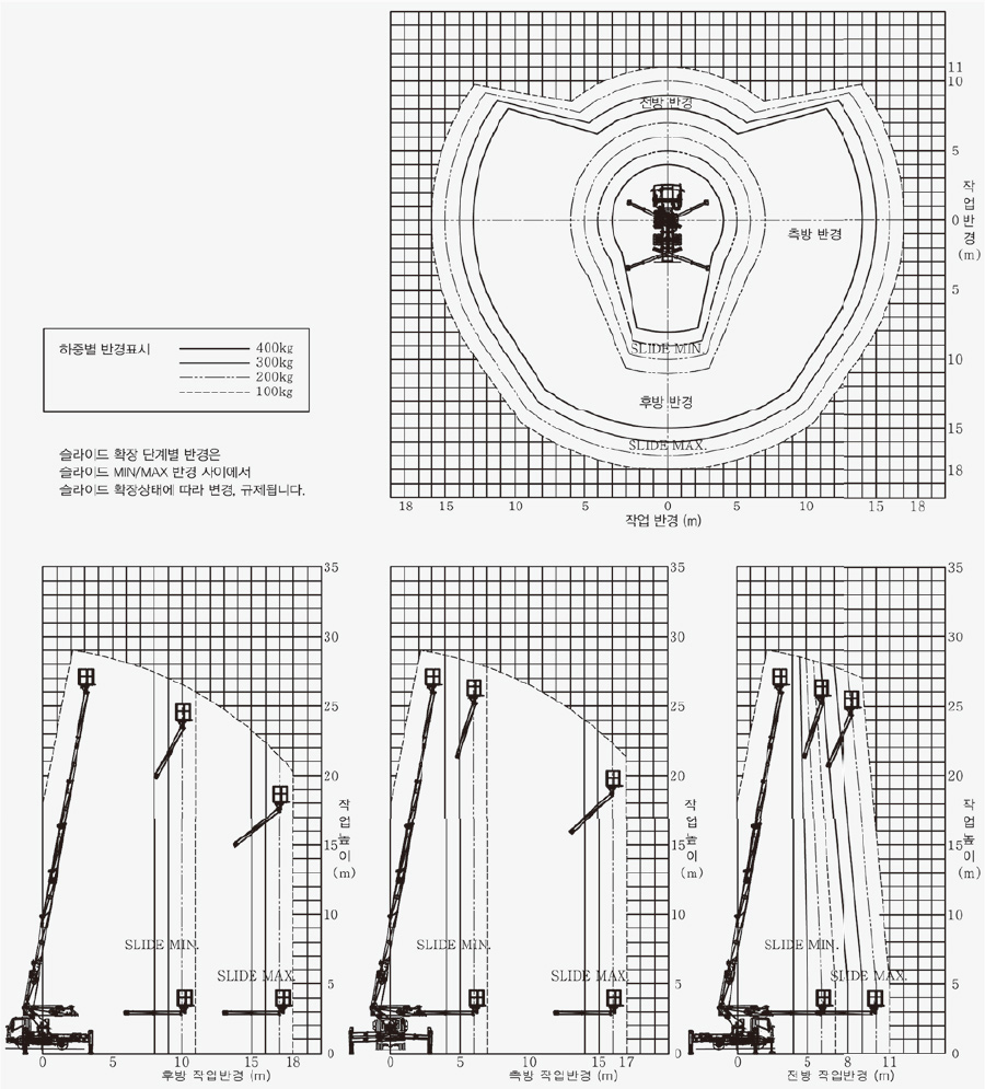 | 작업반경 | m/kg | 15/400 ~ 18/100 | |