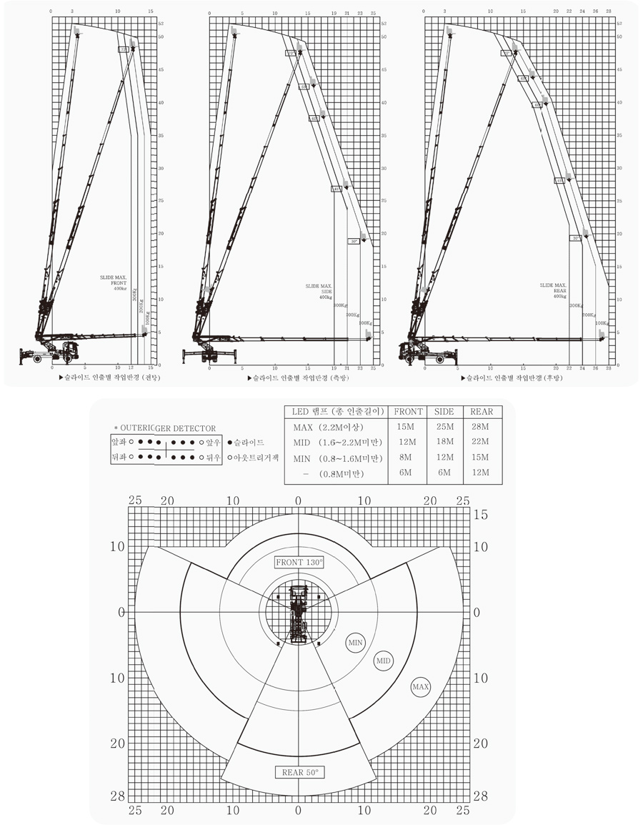 | 작업반경 | m/kg | 후방 400㎏-22m / 100㎏-28m 측방 400㎏-19m / 100㎏-25m 전방 400㎏-12m / 100㎏-15m |