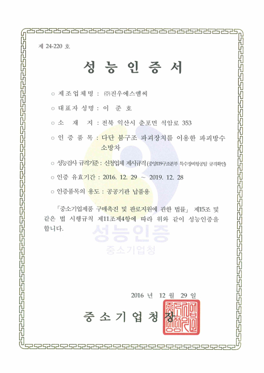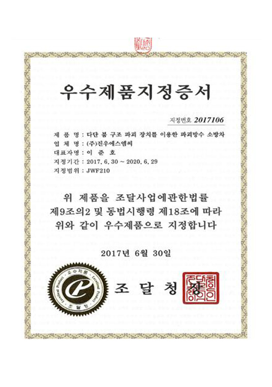 | 1 | 2017106 | Разрушительно-спасательный пожарный автомобиль с водяной пушкой | 2017. 06. 30 |