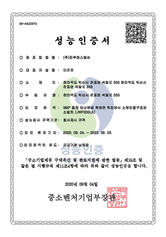 | 2 | 20-AAZ0374 | 360°회전 탑승함을 적용한 직진붐식 소형인명구조용 소방차 | 2020. 09. 04 |