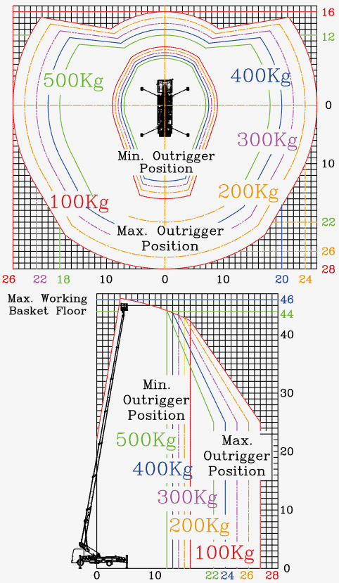 | Max. Outreach | m/kg | 22 - 500, 28 - 100 | 22 - 400, 26 - 100 | Outrigger Max. extended | |